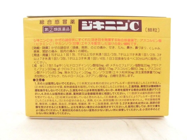 ジキニンCは、アセトアミノフェン、甘草(カンゾウ)エキス、ジヒドロコデインリン酸塩を基本として、さらにビタミンCなどを配合した、すぐれた効きめの総合感冒薬です。